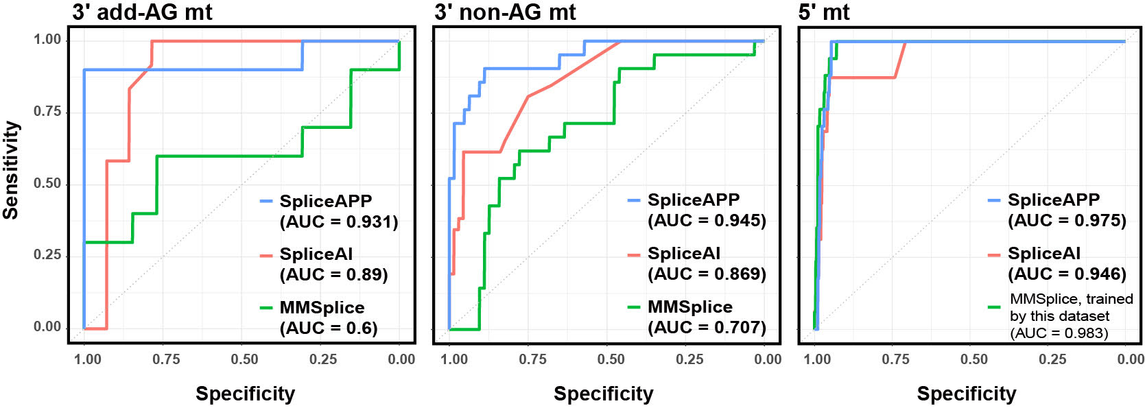 Three predictive models of SpliceAPP achieve high sensitivity and specificity on test datasets. The modeling results suggest that the splicing regulation at the 3' end of introns is more complex than the 5' end.